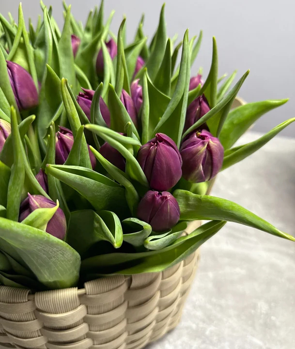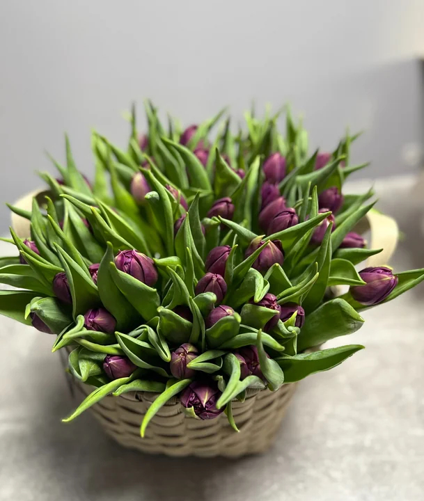 5989Состав: 49 тюльпанов сорта «Pontiac», плетенная корзина