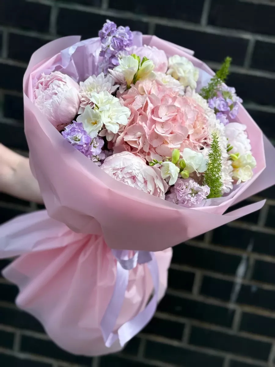 - Цветы в букете: Гортензии,Матиола,Пионы,Фрезии