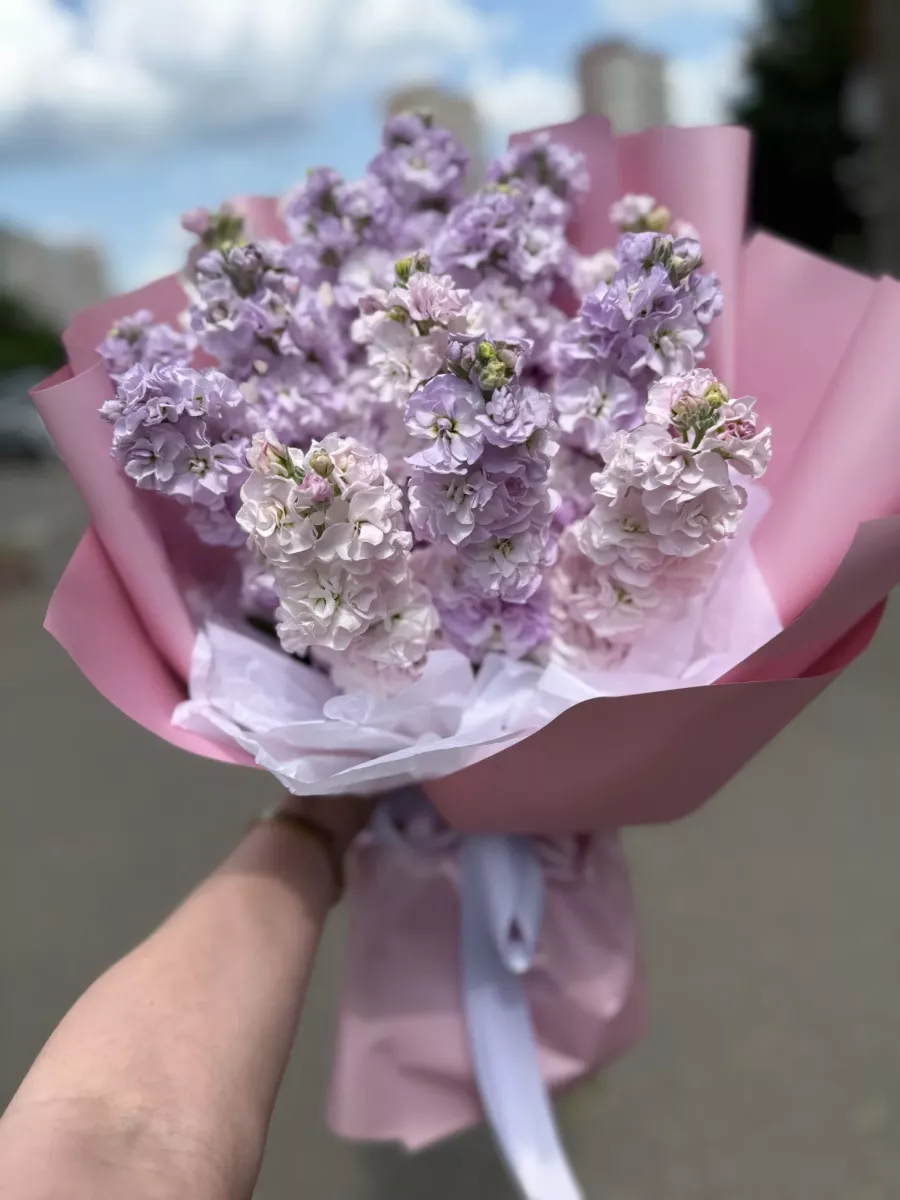 Bouquet of 15 pink and lilac matthiola flowers — delicate, fragrant, and stylish.