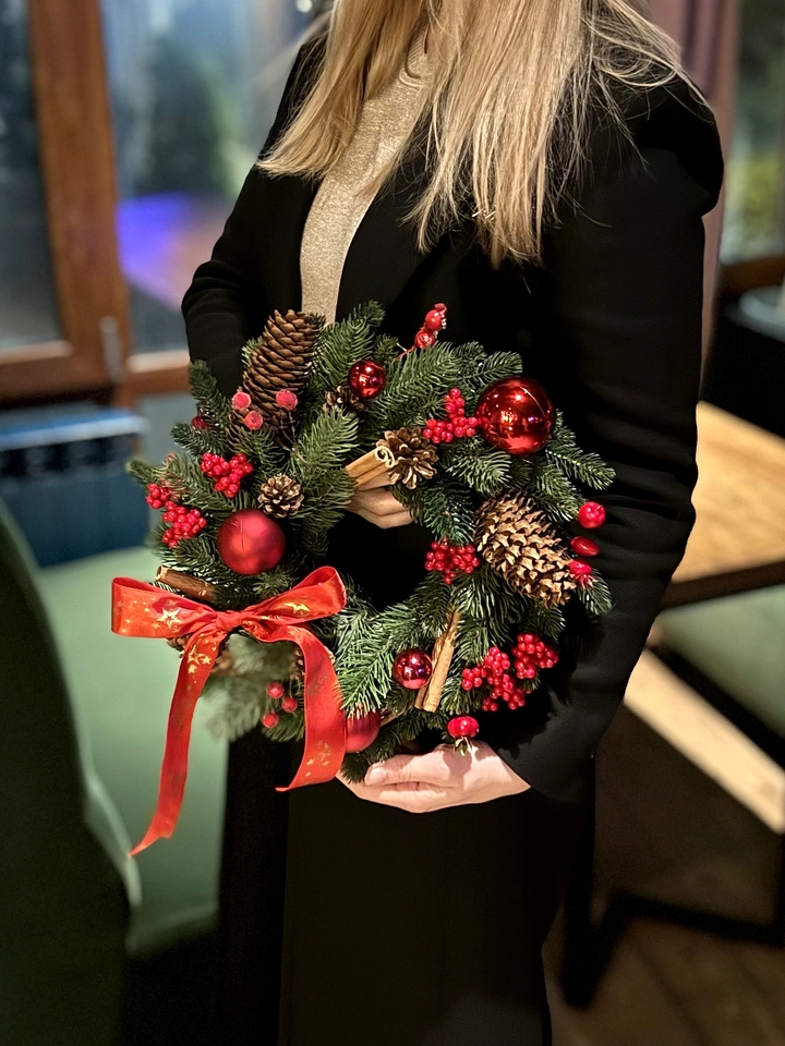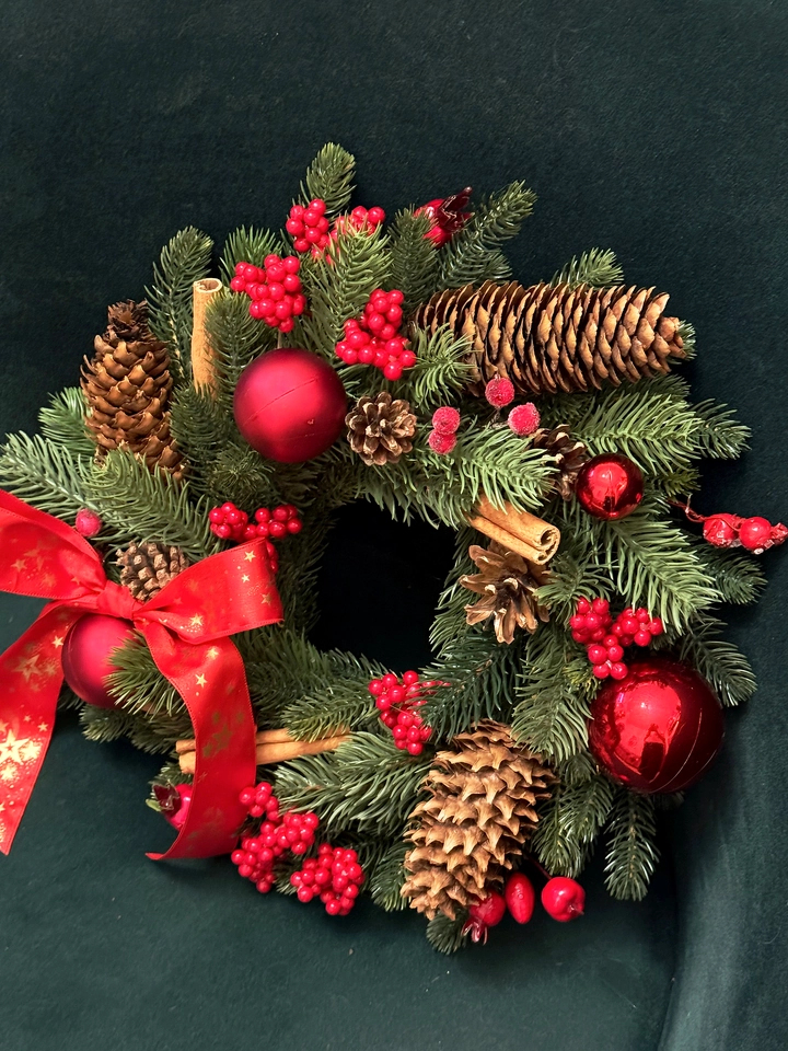 Этот новогодний венок создаёт ощущение тёплого, камерного праздника уже с первого взгляда. Плотная хвойная зелень красиво сочетается с глянцевыми красными шарами, натуральными шишками и ягодами, а палочки корицы добавляют уютный, зимний характер композиции. Яркий красный бант завершает образ и делает венок выразительным акцентом в новогоднем декоре.