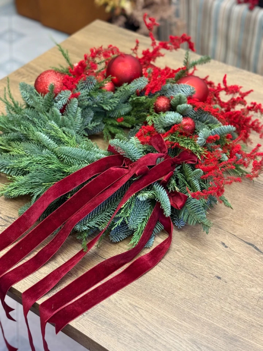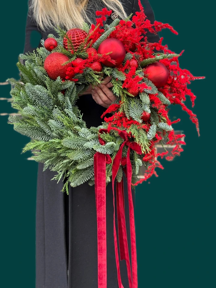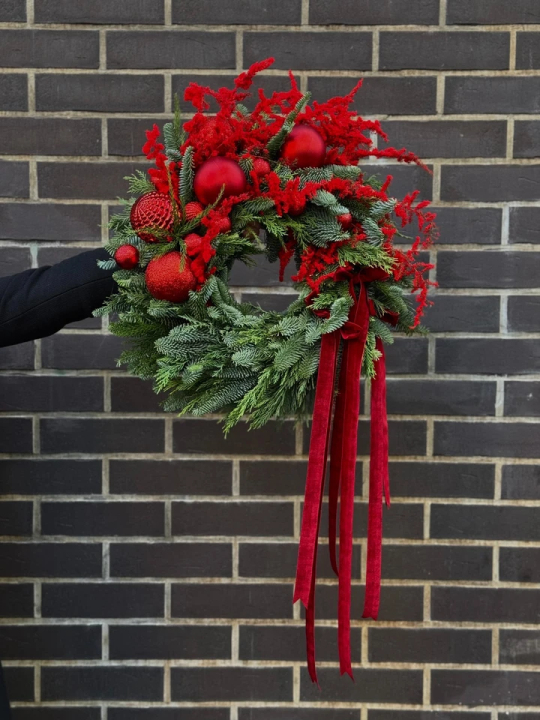 Этот новогодний венок создаёт ощущение тёплого, камерного праздника уже с первого взгляда. Плотная хвойная зелень красиво сочетается с глянцевыми красными шарами, натуральными шишками и ягодами, а палочки корицы добавляют уютный, зимний характер композиции. Яркий красный бант завершает образ и делает венок выразительным акцентом в новогоднем декоре.