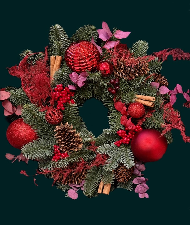 Композиция создана из высококачественных материалов, выглядит дорого и празднично, а главное — долго сохраняет свежесть. Такой венок станет центральным элементом новогоднего оформления дома, офиса, reception-зоны, кафе или магазина.