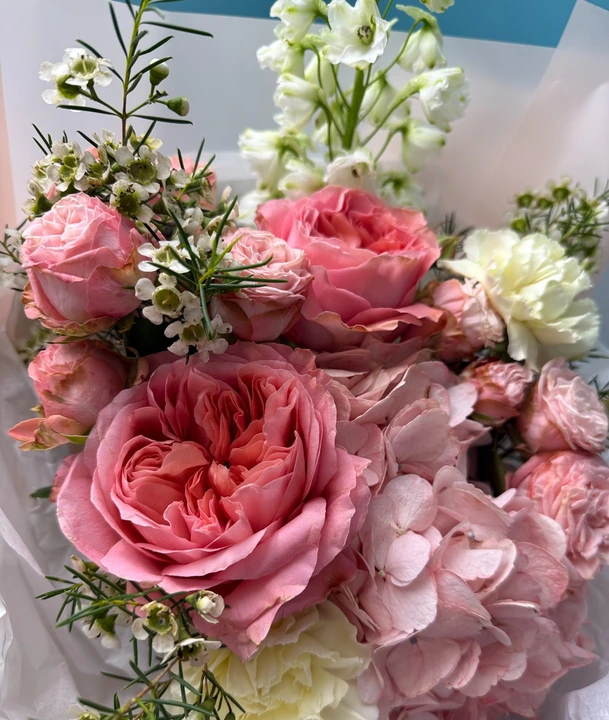 - Цветы в букете: Гортензии,Дельфиниум,Розы
