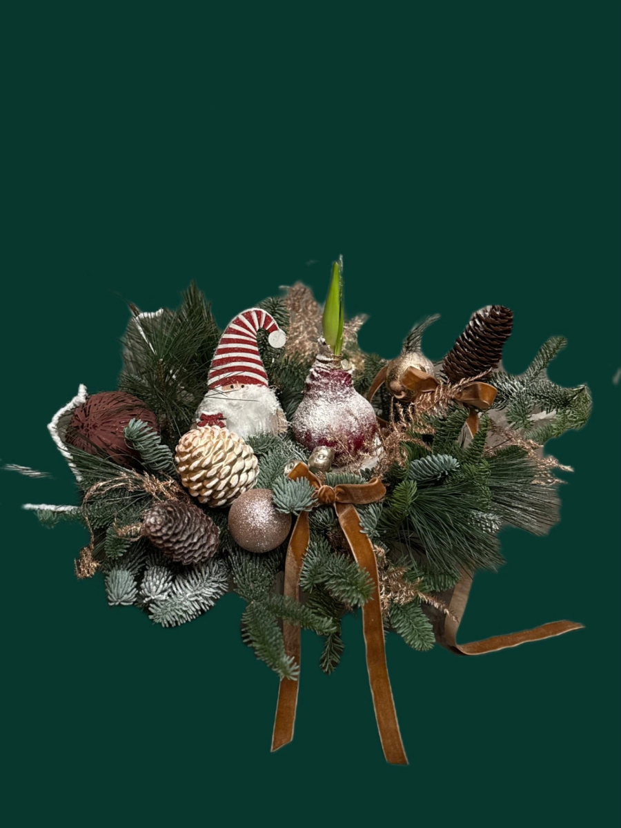 Головним акцентом композиції є жива цибулинна квітка, яка поступово розквітає, додаючи композиції особливого характеру та символізуючи оновлення й початок нового року. Завдяки гармонійному поєднанню природних матеріалів і святкового декору композиція виглядає вишукано та сучасно.