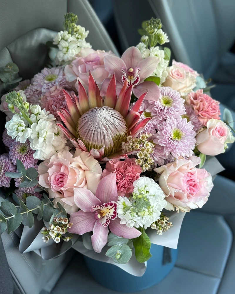 Композиція у капелюшній коробці с протеєю №263. Доставка Квітів Осокорки
