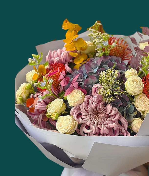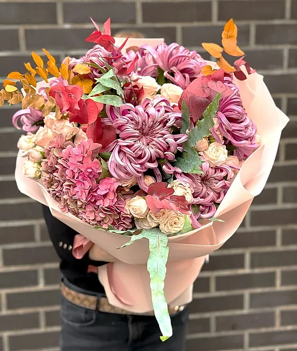 - Квіти в букеті: Гортензії,Розі,Хризантемі